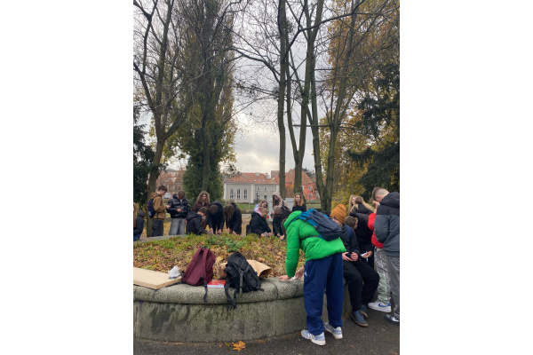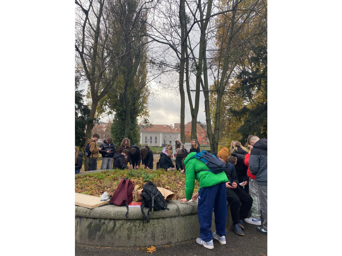 przygotowane stacje tematyczne. Na każdej z nich uczniowie poznawali kolejny fragment biografii patrona, ciekawostki dotyczące jego pracy oraz miejsca istotne dla jego życiorysu. Zadania i pytania przygotowane na stacjach sprawiły, że spacer stał się nie tylko formą aktywności fizycznej, lecz także interesującą lekcją historii lokalnej. Pierwszoklasiści aktywnie i z dużym zaangażowaniem uczestniczyli w wydarzeniu, poznając Bydgoszcz z zupełnie nowej perspektywy – perspektywy naszego patrona. Na zakończenie spaceru na wszystkich uczestników czekał słodki poczęstunek, będący miłym akcentem zamykającym wspólną wędrówkę.