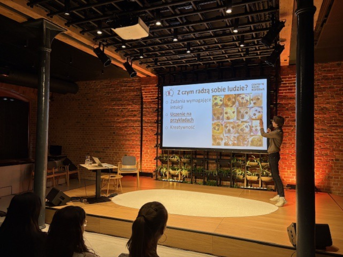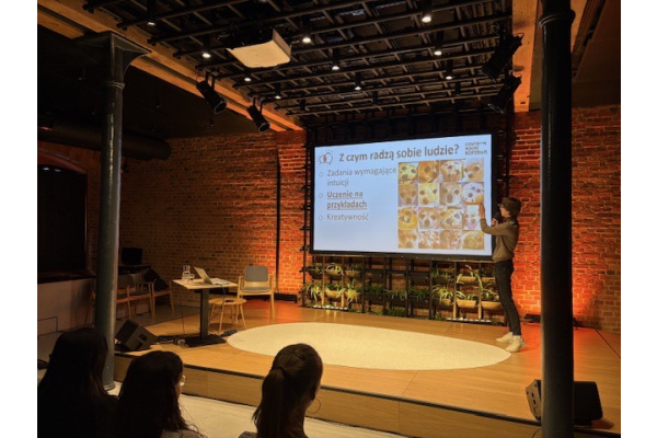 Spotkanie poprowadził p. Cyryl Leszczyński, badacz i dydaktyk w dziedzinie VR/AR oraz edukacji cyfrowej z Uniwersytetu Ekonomicznego w Poznaniu, który w interesujący sposób odpowiedział na pytania dotyczące natury ludzkiego procesu uczenia oraz porównał go ze sposobem "uczenia się" sztucznej inteligencji. Na omówionych przykładach zobaczyliśmy jak sztuczna inteligencja, pomimo ogromnego potencjału, potrafi mylnie interpretować dane oraz odpowiedzieliśmy sobie na pytanie, czy jest ona tak kreatywna jak ludzie?