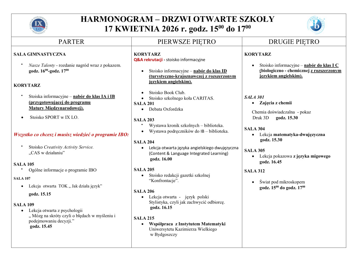 Harmonogram Drzwi Otwarte 17 kwietnia 15.00-17.00