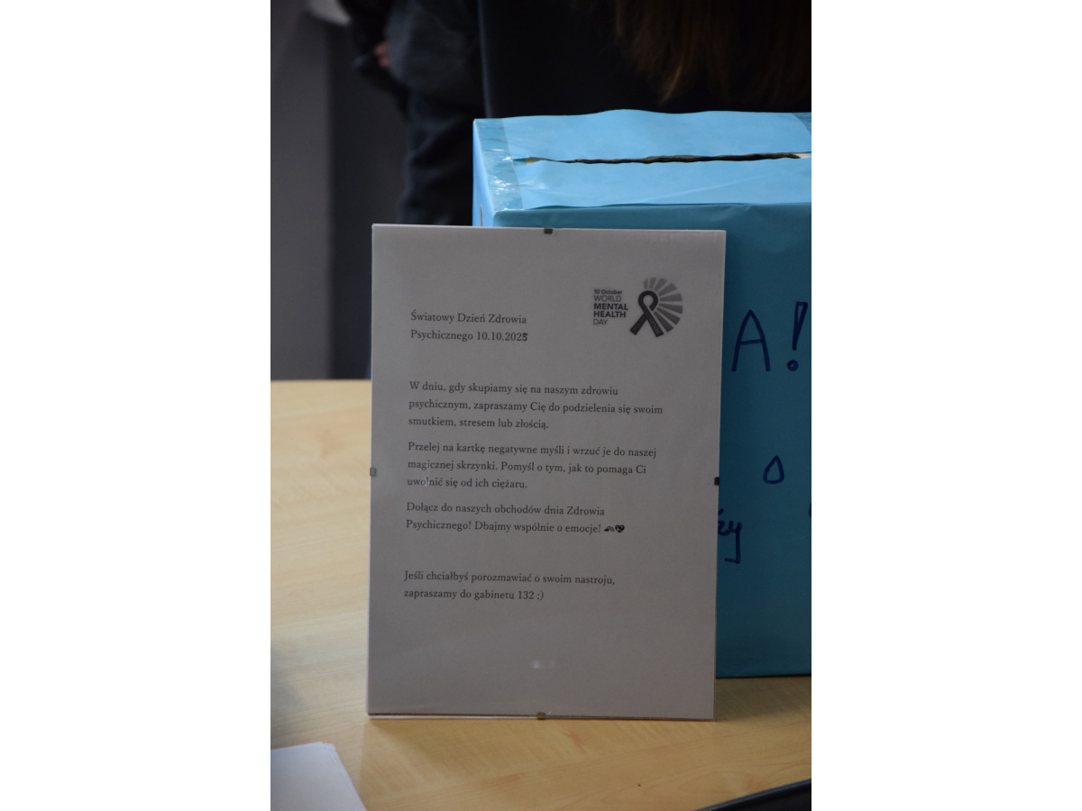 W naszej szkole, jak co roku, z wielką uwagą i zaangażowaniem obchodziliśmy Światowy Dzień Zdrowia Psychicznego. To wyjątkowy czas, aby przypomnieć wszystkim, jak ważna jest dbałość o nasz wewnętrzny spokój, emocje i dobre relacje z innymi.