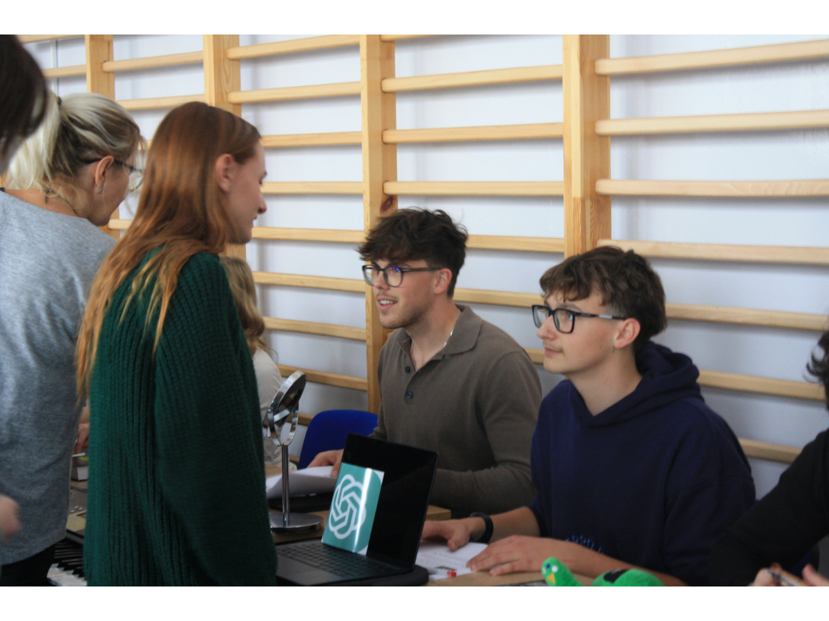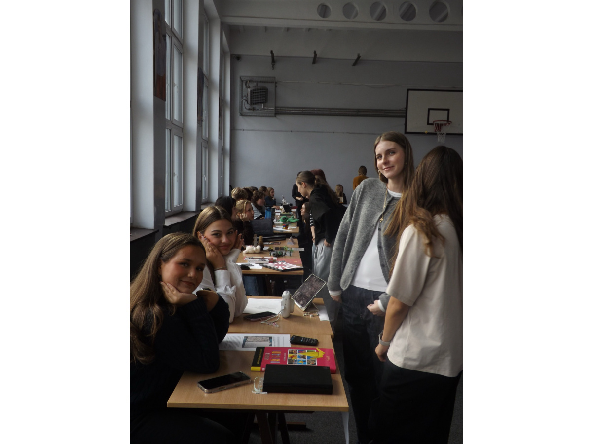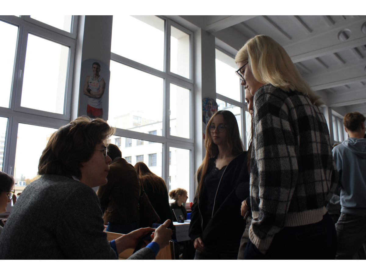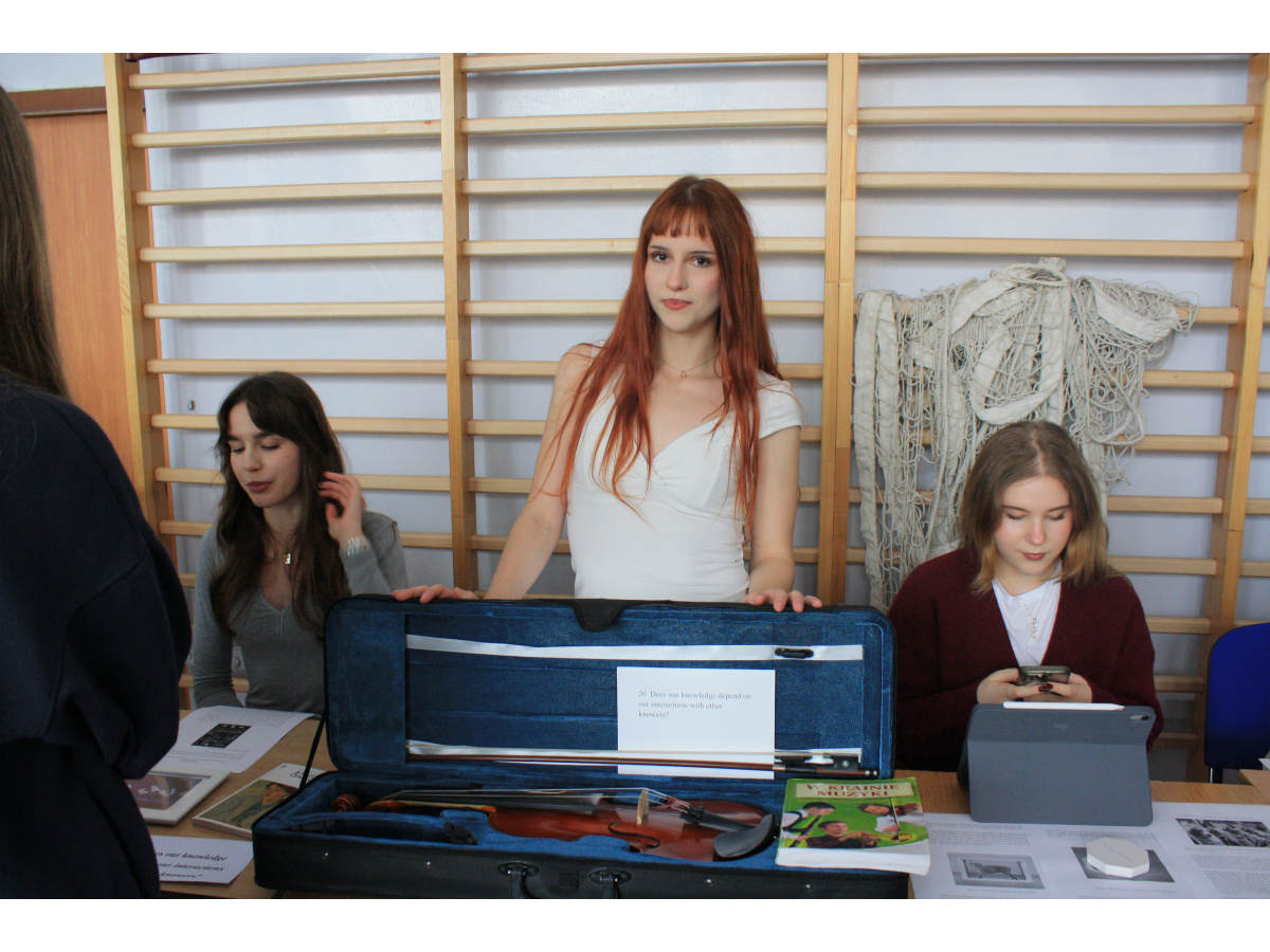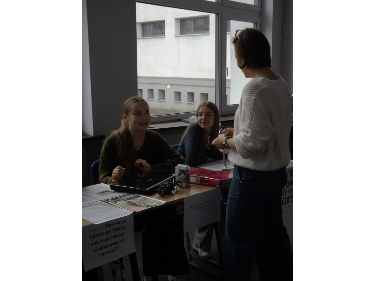 Podczas wystawy można było usłyszeć wiele ciekawych rozmów i interpretacji. Goście chętnie zatrzymywali się przy poszczególnych stanowiskach, pytając autorów o inspiracje i proces tworzenia. Atmosfera była swobodna, refleksyjna i pełna intelektualnej ciekawości – dokładnie taka, jaka towarzyszy duchowi przedmiotu TOK.