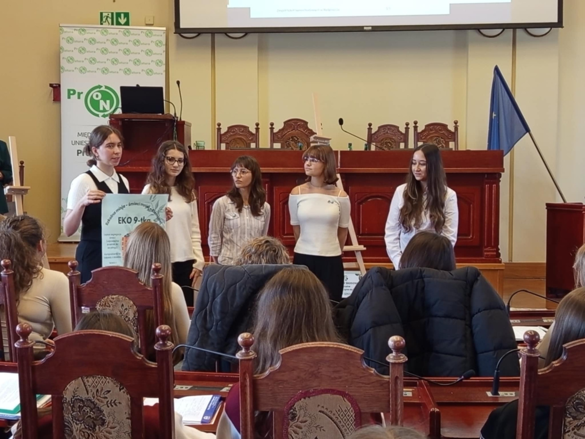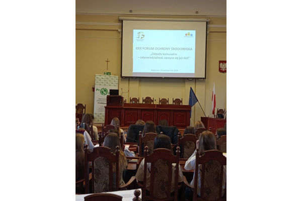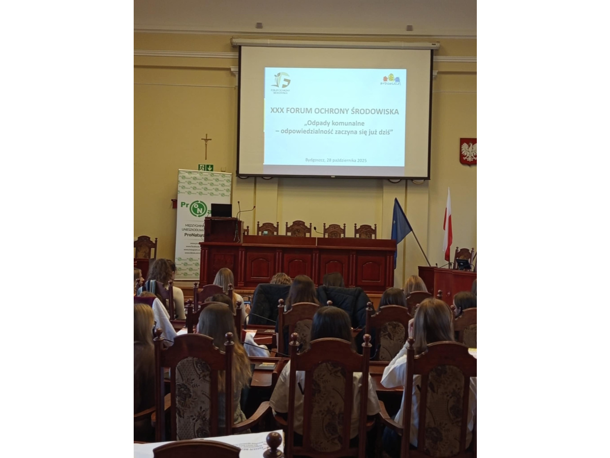 28 października 2025 roku w Sali Sesyjnej Ratusza odbyło się jubileuszowe, XXX Forum Ochrony Środowiska. Hasłem przewodnim tegorocznej edycji było: „Odpady komunalne – odpowiedzialność zaczyna się już dziś”. Uczennice IX Liceum Ogólnokształcącego w składzie: Sara Czarnota (3A), Maja Derecka (3B), Sara Helal (3A), Alicja Hoffman (3A) i Nina Sztubińska (3B) wraz z opiekunem – panią Kamilą Marchlewicz – po raz kolejny wzięły udział w tym wydarzeniu. Podczas spotkania uczestnicy wysłuchali interesujących prelekcji dotyczących m.in. systemu gospodarki odpadami komunalnymi, działania elektrociepłowni ProNatury oraz zasad funkcjonowania Punktów Selektywnej Zbiórki Odpadów Komunalnych.